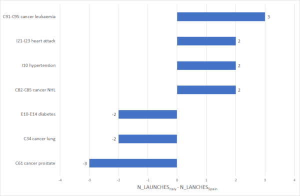 Figure 2: Difference between number of drugs launched during 1982-2015 for 7 diseases in Italy and Spain